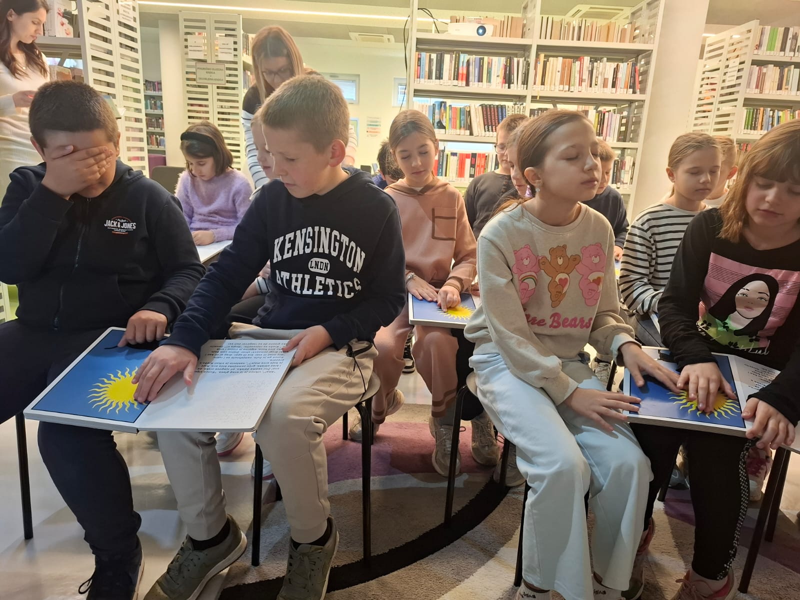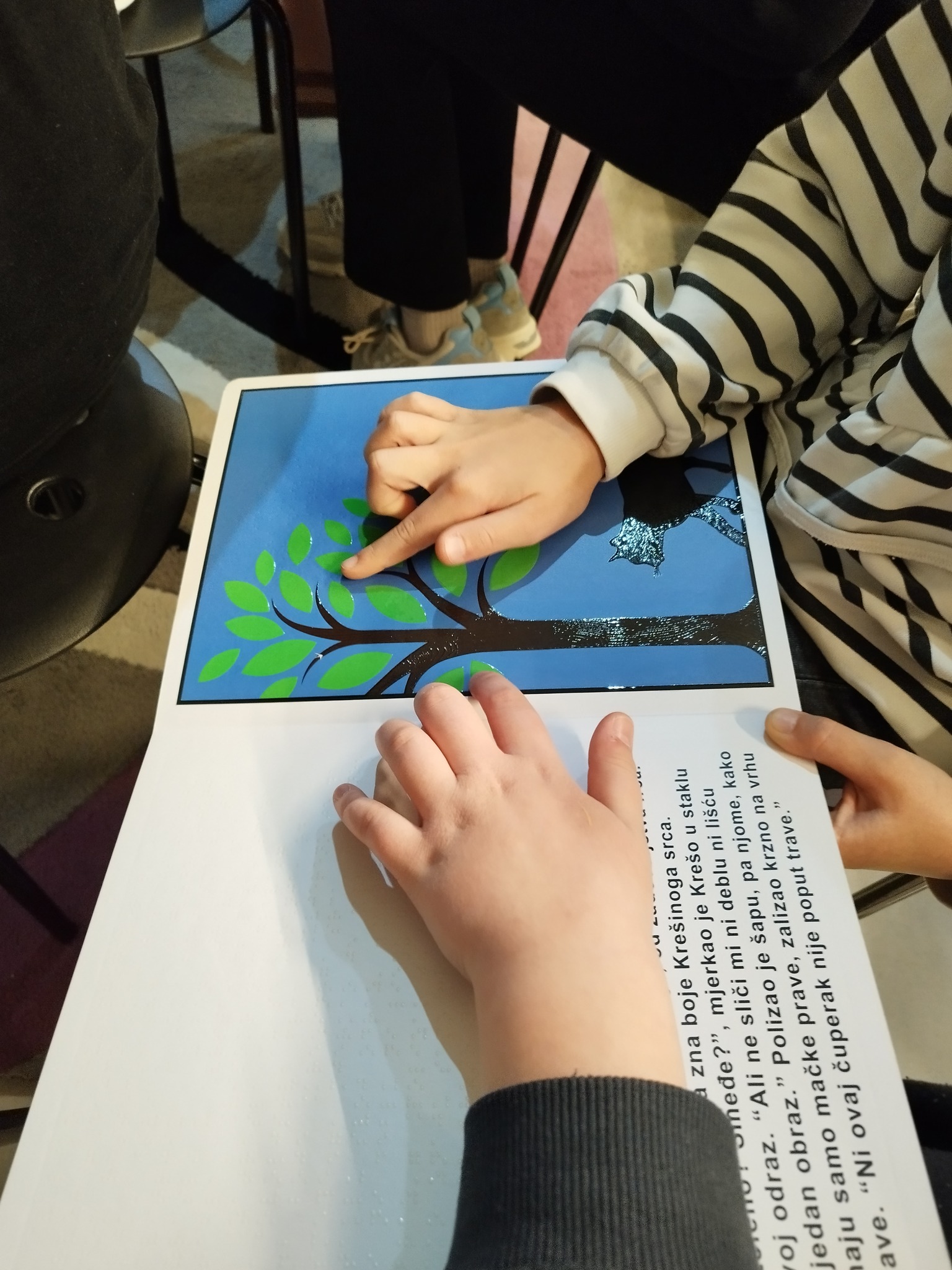 Kroz taktilnu slikovnicu "Mačak Krešo se pita: Koje je boje srce moje“ učenici su se upoznali s Brailleovim pismom (priču je čitala Jasmina, a djeca su sa slikovnicom u ruci i zatvorenih očiju pratili tekst prstima te na taj način pokušali doživjeti priču).